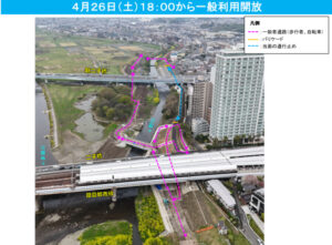 多摩川・二子玉川地区の堤防が3月に完成し、通行路(一部)が開放されました。